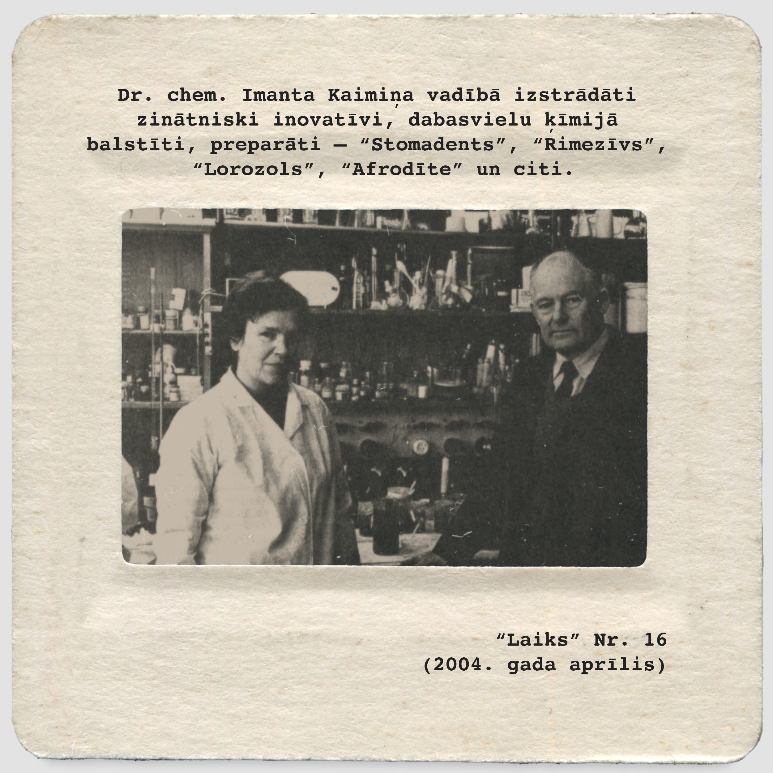Laikrakstā "Laiks" publicēts raksts par LVKĶI Biokompozītu laboratoriju, kur ķīmijas doktora Imanta Kaimiņa vadībā, strauji attīstās jaunas paaudzes ārstniecības un kosmētikas līdzekļu izstrāde, izmantojot dabas vielas. No laboratorijā tapušā pirmā produkta – zobu un mutes higiēnas līdzekļa “Stomadents” – līdz pasaules atzinību guvušajam brūču dziedēšanas līdzeklim “Rimezīvs”, kas tika izmantots Černobiļas katastrofas seku likvidēšanā un humānās palīdzības misijās Armēnijā un Irākā. Imanta Kaimiņa komanda turpina veidot plašu dabasvielās bāzētu produktu klāstu: Lorozolu pret elpceļu infekcijām, biodabīgus krēmus roku un kāju aizsardzībai, chitozāna produktus gļotādu aizsardzībai un holesterīna līmeņa pazemināšanai, Hitopolu, ko tolaik dēvēja par kabatas izmēra “ambulanci” ātrai brūču aizsardzībai. Biokompozītu laboratorijas un Zinātniskās ražošanas uzņēmuma “Medicamina” attīstītie produkti apvienoja klasiskās zināšanas par dabas vielām ar modernu, saudzējošu tehnoloģiju izmantošanu.
