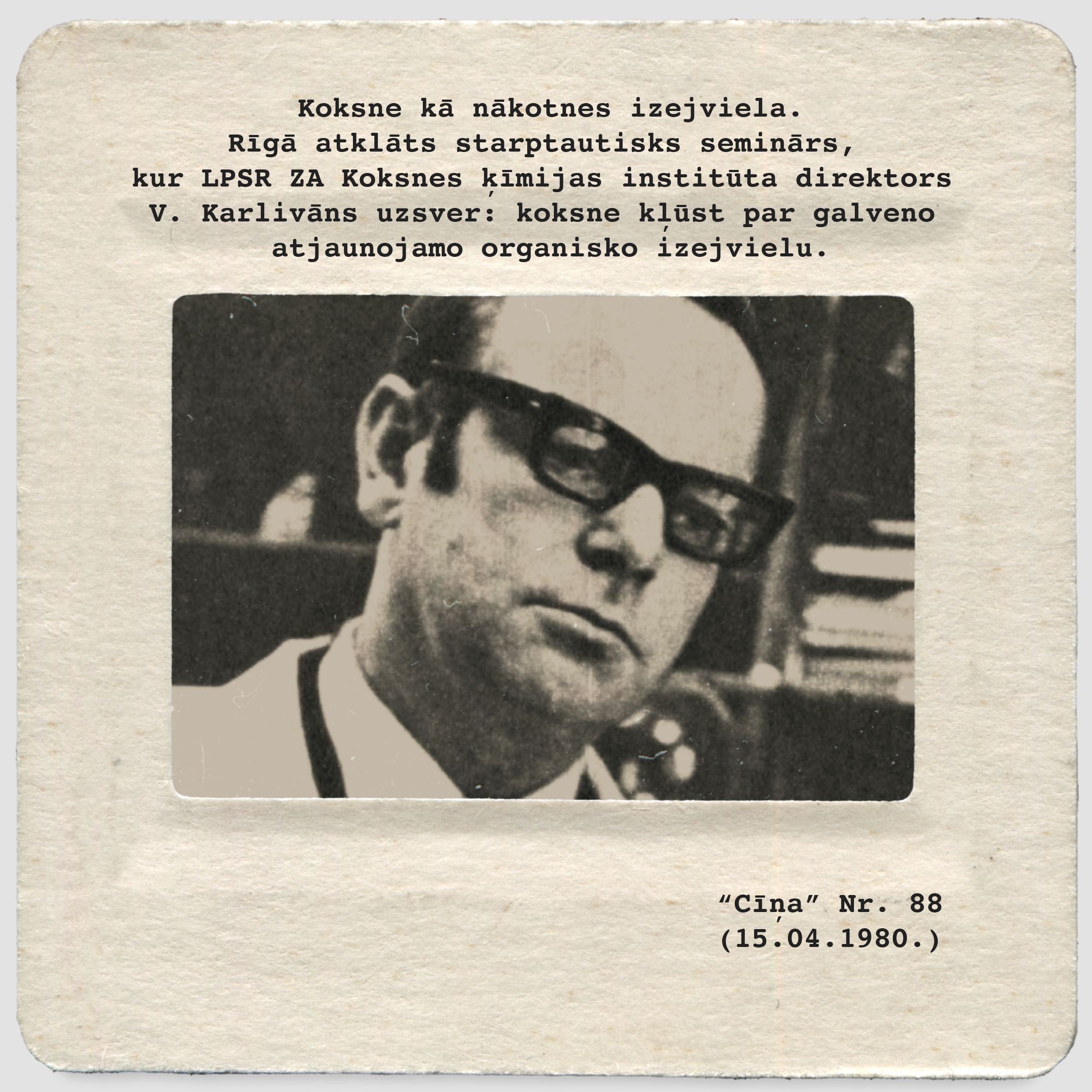 Laikraksts "Cīņa" ziņo par starptautisku semināru, kas veltīts koksnes kā nākotnes izejvielas potenciālam. Profesors Vladimirs Karlivāns uzsver, ka, samazinoties tradicionālo resursu – ogļu, naftas un gāzes – apjomiem, koksne kļūst par stratēģisku izejvielu, jo tā ir fotosintēzes ceļā nepārtraukti atjaunojama. Pasaule ik gadu rada ap 200 miljardiem tonnu biomasas, kas krietni pārsniedz fosilo resursu ieguvi. Zinātnieki aicina pilnvērtīgi izmantot visus koksnes komponentus – hemicelulozi, celulozi, lignīnu, - lai iegūtu cukurus, spirtus, furfurolu un citus vērtīgus produktus, kas noder plastmasu, degvielu un sintētisko šķiedru ražošanā.