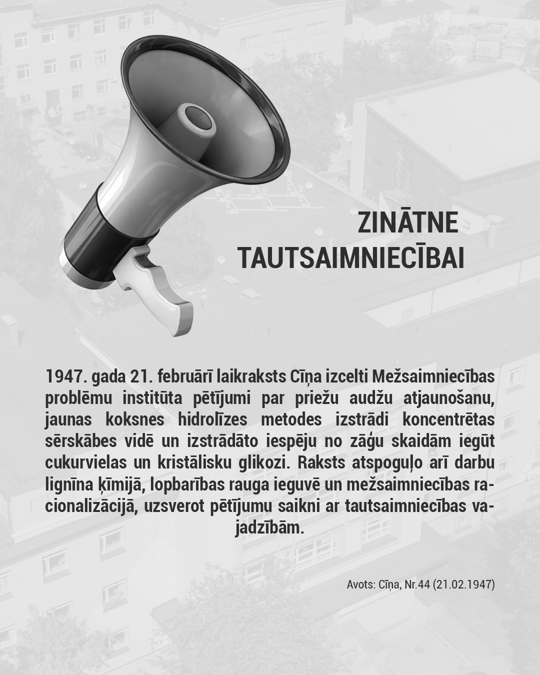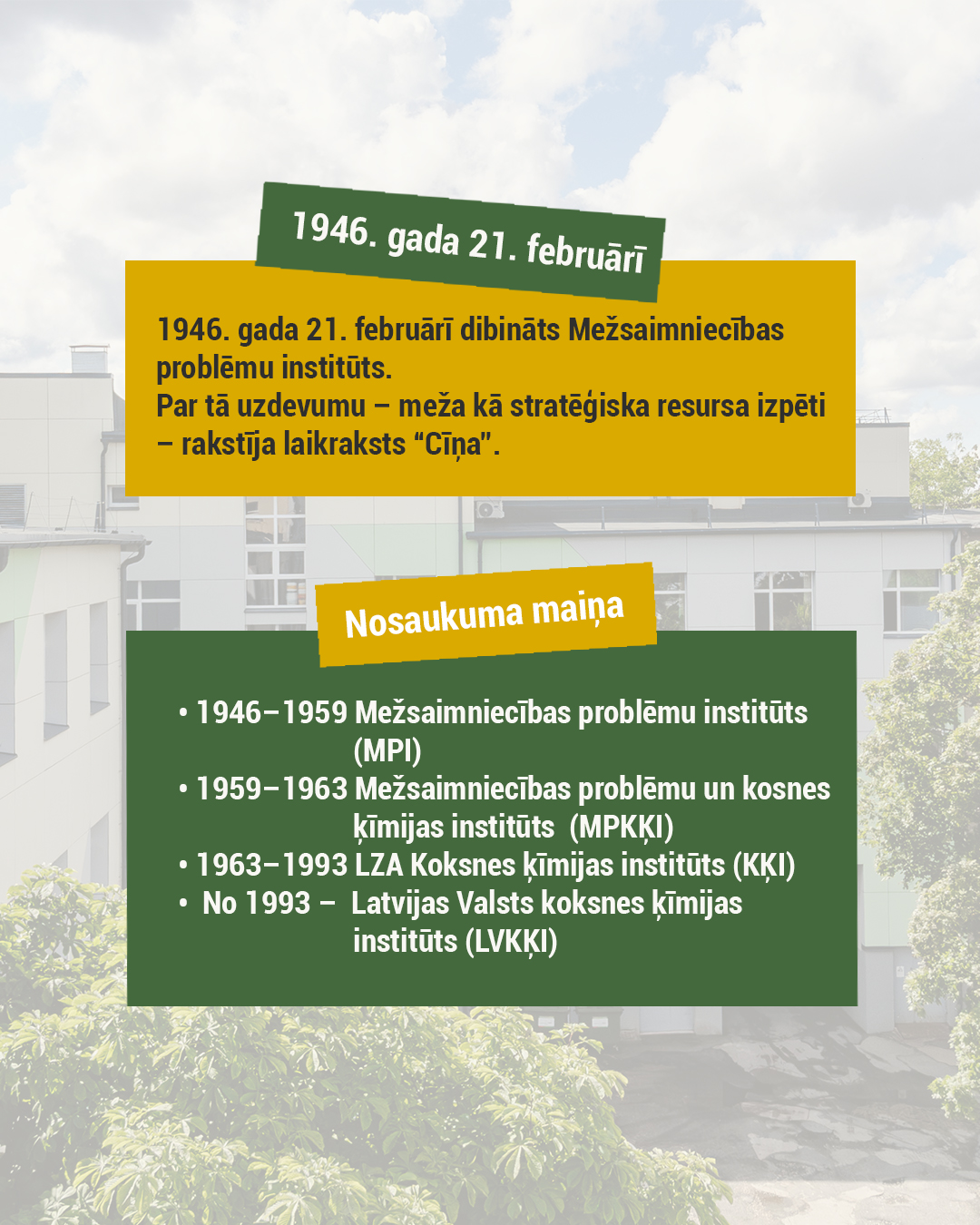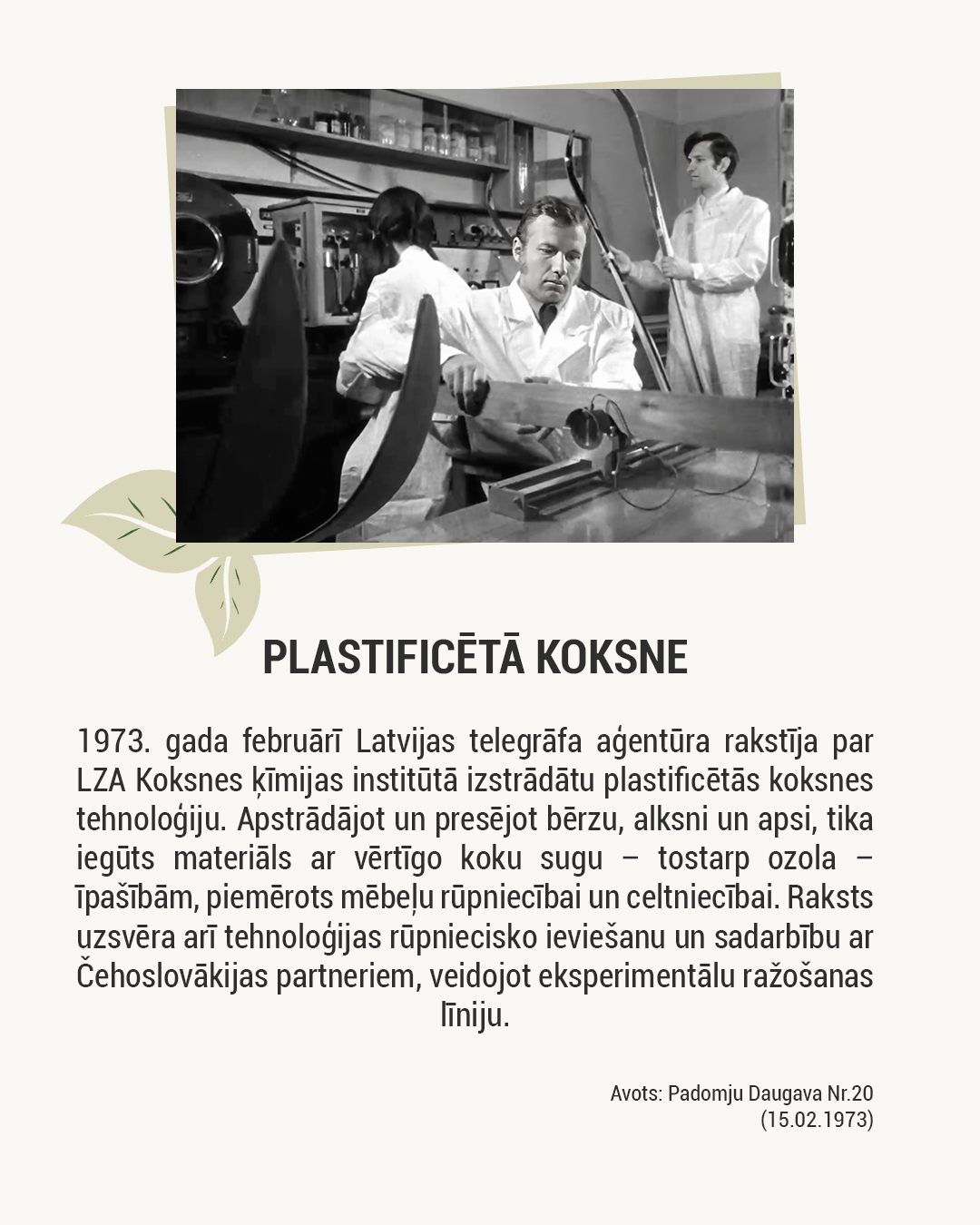 Par godu šim notikumam esam izveidojuši īsu vizuālu karuseli, kurā atspoguļots, kā institūta pētījumi presē tikuši atainoti no 1946. līdz 2025. gadam. Atlasē iekļautas dažādu gadu februāra publikācijas — tā ir tikai neliela daļa no daudz plašākas mediju klātbūtnes: ,o meža atjaunošanas un lignīna ķīmijas līdz plastificētajai koksnei, bioloģiskas izcelsmes poliuretāniem, kriogēnajai izolācijai kosmosam un bērza tāss ekstraktvielām.