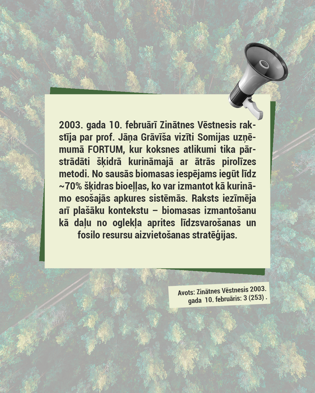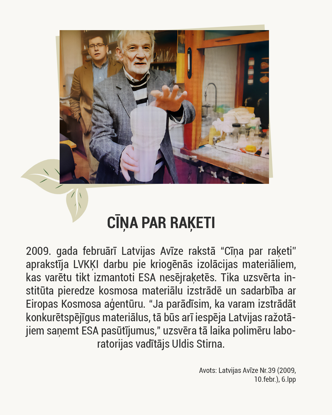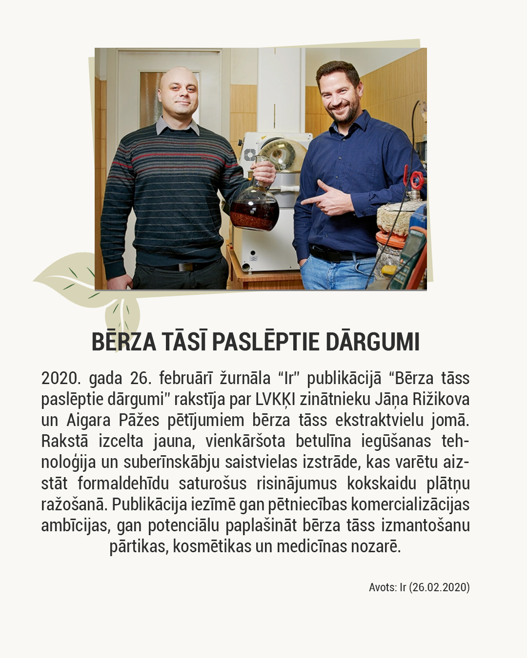 Par godu šim notikumam esam izveidojuši īsu vizuālu karuseli, kurā atspoguļots, kā institūta pētījumi presē tikuši atainoti no 1946. līdz 2025. gadam. Atlasē iekļautas dažādu gadu februāra publikācijas — tā ir tikai neliela daļa no daudz plašākas mediju klātbūtnes: ,o meža atjaunošanas un lignīna ķīmijas līdz plastificētajai koksnei, bioloģiskas izcelsmes poliuretāniem, kriogēnajai izolācijai kosmosam un bērza tāss ekstraktvielām.