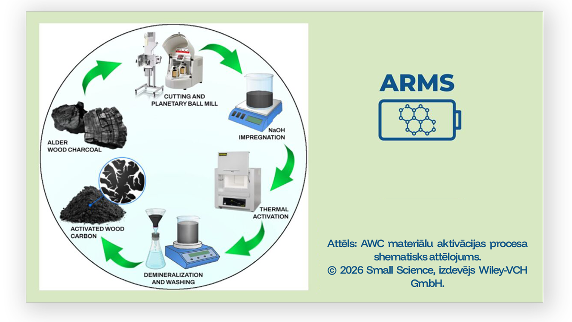ARMS konsorcijs atzīmē jaunu zinātnisku sasniegumu – kopīgu publikāciju, kas parāda, kā ilgtspējīgi materiāli un gudra inženierija var no jauna definēt drukāto enerģijas uzkrāšanas ierīču iespējas. Jaunajā Small Science brīvpieejas rakstā pētnieku komanda – Hamed Pourkheirollah, Remuel Isaac M. Vitto, Jari Keskinen un Matti Mäntysalo no Tamperes Universitātes, Dāvis Kalniņš, Līga Grīnberga, Anatolijs Šarakovskis un Gints Kučinskis no Latvijas Universitātes Cietvielu fizikas institūta, Aleksandrs Volperts no Latvijas Valsts koksnes ķīmijas institūta (LVKĶI) un Steffen Thrane Vindt no uzņēmuma InnoCell ApS – prezentē nozīmīgu izrāvienu augstas veiktspējas drukāto superkondensatoru izstrādē. Tie veidoti no ar NaOH aktivētas ogles, kas iegūts no alkšņa koksnes – biomases izejvielas, kas ir plaši pieejama, atjaunojama un, pareizi apstrādāta, izrādās pārsteidzoši efektīva.