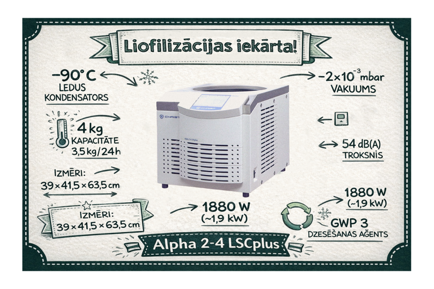 LVKĶI laboratorijā uzstādītā liofilizācijas sistēma nodrošina augstu procesa kontroli un elastību. Tā ļauj sasniegt dziļu sasaldēšanu līdz –90 °C un ir aprīkota ar sensoriem vakuuma, spiediena un parauga temperatūras uzraudzībai, kā arī eitektiskā punkta noteikšanai. Vienmērīgu žāvēšanu nodrošina apsildāmi plaukti ar homogēnu temperatūras sadalījumu, savukārt 32 saglabājamas programmas ļauj automatizēt dažādus procesa ciklus. Datu pārraide tiek nodrošināta caur tīmekli, kā arī sistēmu iespējams papildināt ar dažādiem piederumiem kolbām, kamerām un piloteksperimentiem.