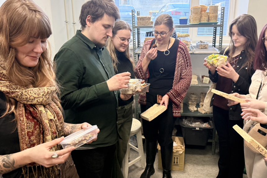 Praktiskajā daļā mikoloģe Dr. biol. Ilze Irbe iepazīstināja ar pētījumiem koksnes biodegradācijas jomā, kā arī skaidroja koksni noārdošo sēņu izplatību koka konstrukcijās. Tika demonstrēta arī micēlija kompozītu izstrāde un apskatītas to iespējamās pielietošanas jomas – iepakojuma materiālos, izolācijas risinājumos un lauksaimniecībā.