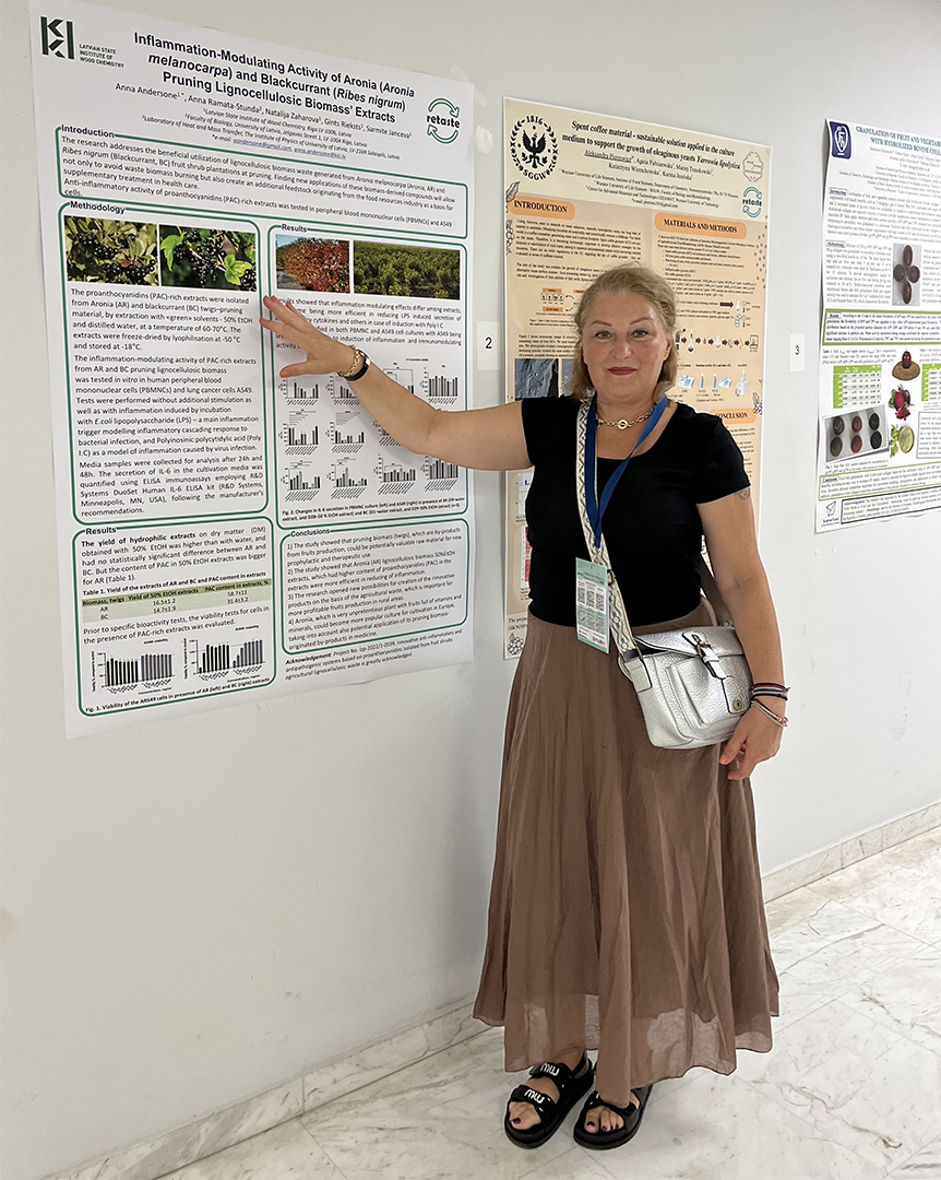 Latvijas Valsts koksnes ķīmijas institūtu konferencē pārstāvēja LVKĶI pētnieces Anna Andersone un Natālija Zaharova, kuras prezentēja pētījumu “Inflammation-Modulating Activity of Aronia (Aronia melanocarpa) and Blackcurrant (Ribes nigrum) Pruning Lignocellulosic Biomass’ Extracts”, kas īstenots FLPP projekta Nr. lzp-2022/1-0599 ietvaros.