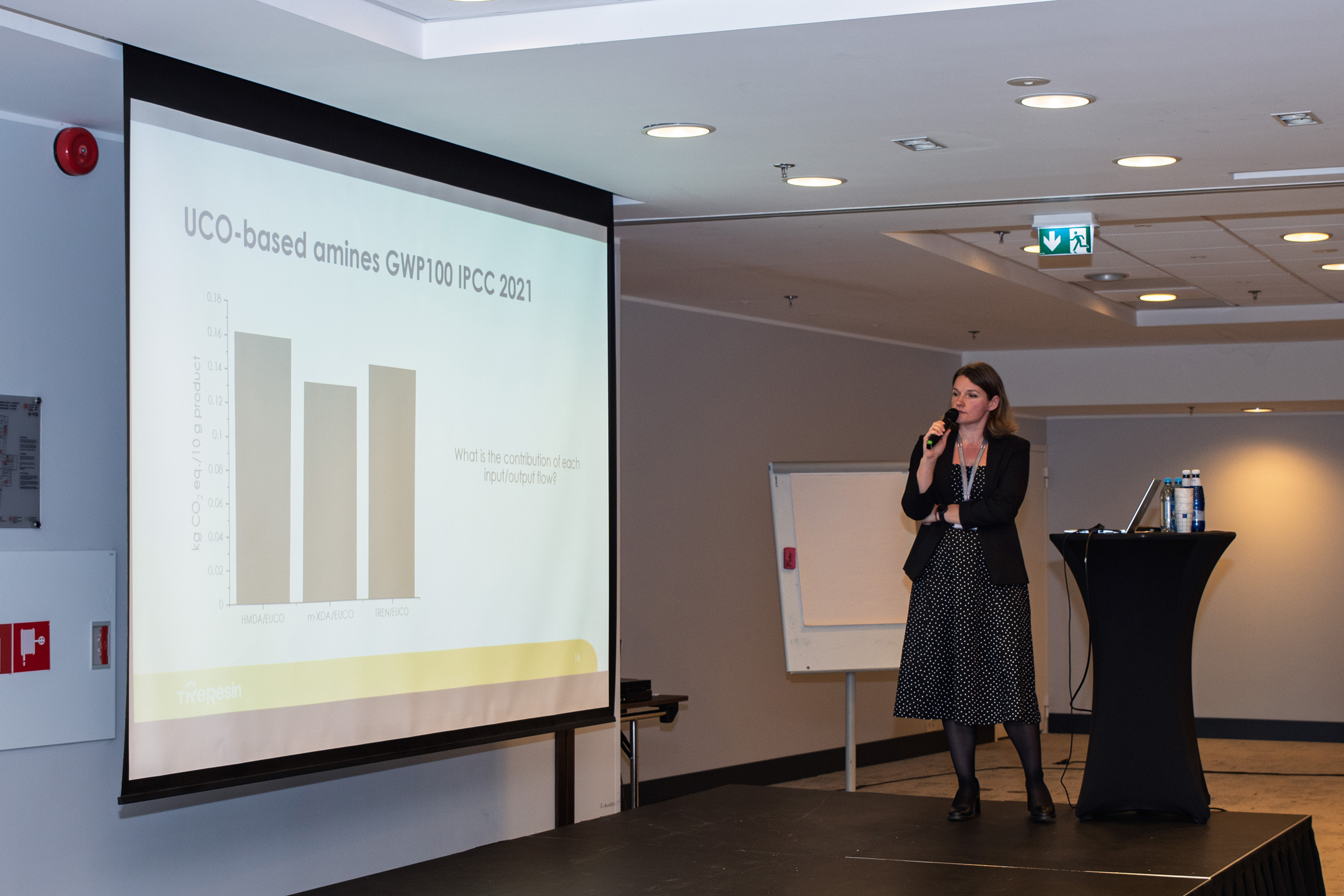 Polimēru laboratorijas vadošā pētniece Ph.D. Anda Fridrihsone prezentēja tēmu “Environmental Assessment of Aza-Michael Donors Based on Used Cooking Oil for Reprocessable Thermoset Polymers”. Savukārt pētnieks Mg.chem. Arnis Āboliņš simpozija dalībniekus iepazīstināja ar jauno savienojumu izstrādes ķīmiskajiem aspektiem prezentācijā “Valorization of Used Cooking Oil into Aza-Michael Donors for Reprocessable Thermoset Polymers”. Abi pētnieki pārstāvēja vienu no modernās polimērķīmijas progresīvākajām tēmām, ko pēta LZP FLPP projektā Nr. lzp-2024/1-0333 TReResin - otrreizēji pārstrādājamu termoreaktīvo polimēru izstrādi no atjaunojamiem resursiem. Abas uzstāšanās izgaismo TReResin projekta būtību: atkritumplūsmu, piemēram, izmantotās cepamās eļļas pārvēršanu pārstrādājamos, termoreaktīvos polimēros un novērtēt to ietekmi uz vidi, izmantojot dzīves cikla novērtējuma metodi, lai identificētu “karstos punktus” un uzlabojumu jomas.