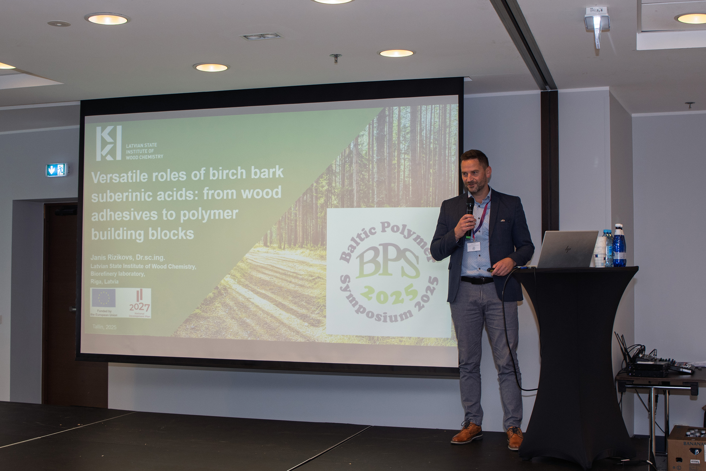 Plenārlekcijā Biorafinēšanas laboratorijas vadītājs Dr.sc.ing. Jānis Rižikovs aplūkoja bērza mizas suberīnskābju (SA) izmantošanas iespējas – no ekoloģiskas koksnes saistvielas līdz poliuretāna prekursoriem un polimēru kompozītmateriāliem. Pētījumos parādīts, ka bērza tāsī esošais suberīns, kas līdz šim uztverts kā blakusprodukts, var kļūt par vērtīgu atjaunojamu izejvielu jaunu biopolimēru un kompozītmateriālu izstrādē. Ar suberīnskābēm iegūtie kompozītmateriāli demonstrē augstu mehānisko stiprību un mitrumizturību, ļaujot aizstāt sintētiskos risinājumus un būtiski samazināt materiālu ietekmi uz vidi.