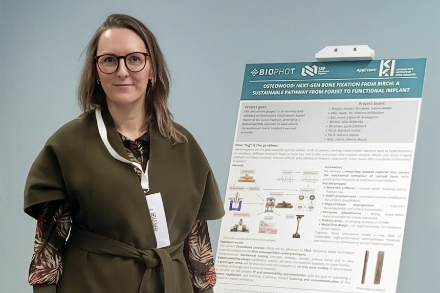 Latvijas Valsts koksnes ķīmijas institūtu konferencē pārstāvēja vadošā pētniece Dr.chem. Laura Andže, kura “BioPhoT” ietvaros īsteno projektu OsteoWood. Projekta mērķis ir izstrādāt un validēt inovatīvu bērza koksnes materiālu osteosintēzes implantiem, piedāvājot bioloģiski saderīgu alternatīvu pacientiem, kuriem tradicionālie metāla implanti (piemēram, titāna vai tērauda) nav piemēroti. Apmēram 2–5 % pacientu cieš no alerģiskām reakcijām vai metālu nepanesamības, un OsteoWood piedāvā risinājumu tieši šādās situācijās. OsteoWood komanda izstrādā daļēji delignificētus, blīvinātus un mehāniski izturīgus bērza koksnes paraugus, kurus impregnē ar oligo-hitozānu, lai uzlabotu bioloģisko saderību un formas stabilitāti. Materiāls tiks attīstīts līdz TRL3 līmenim, veicot mikroskopiskās struktūras analīzi, mehāniskos testus un šūnu saderības pārbaudes laboratorijā.