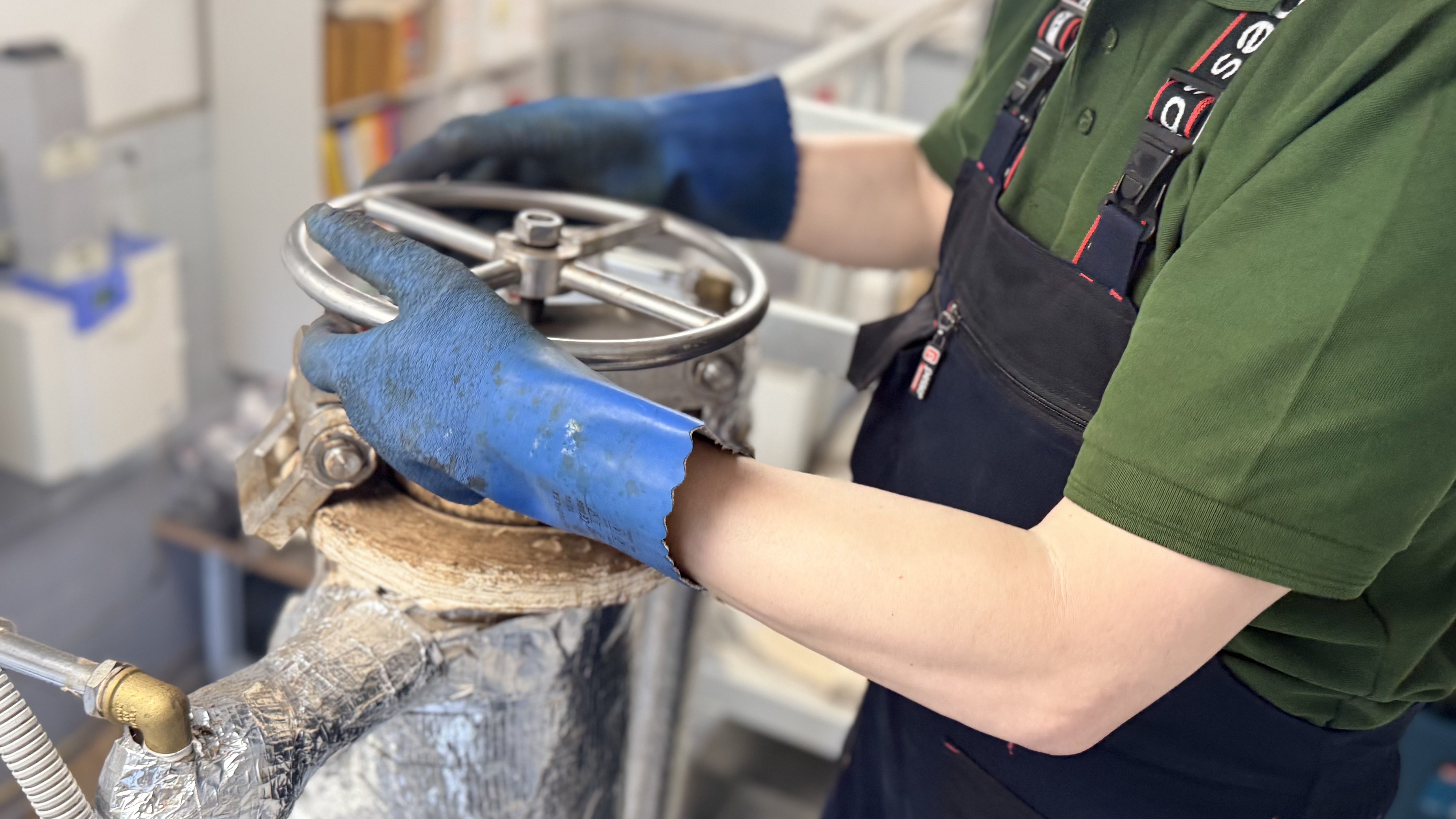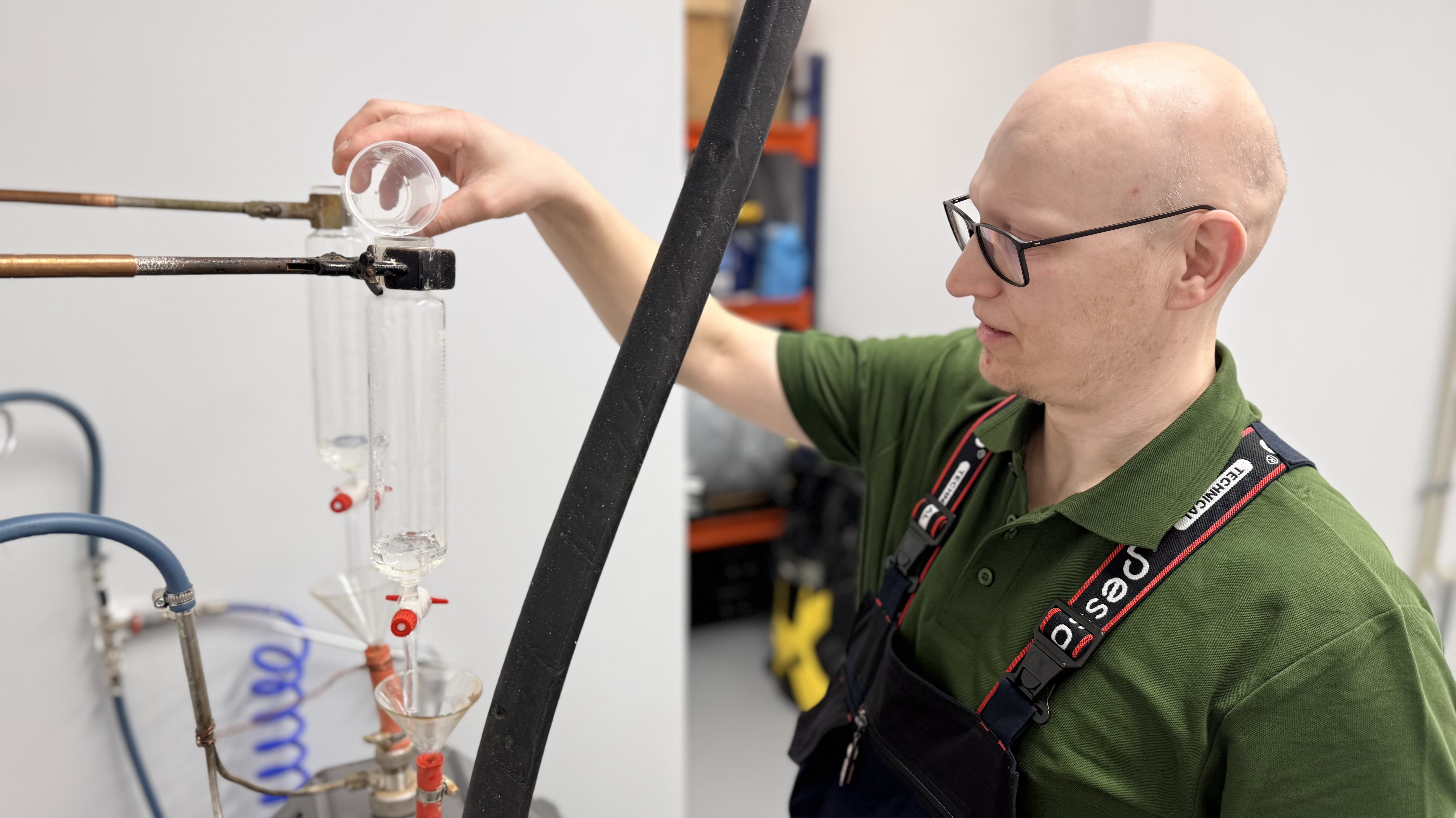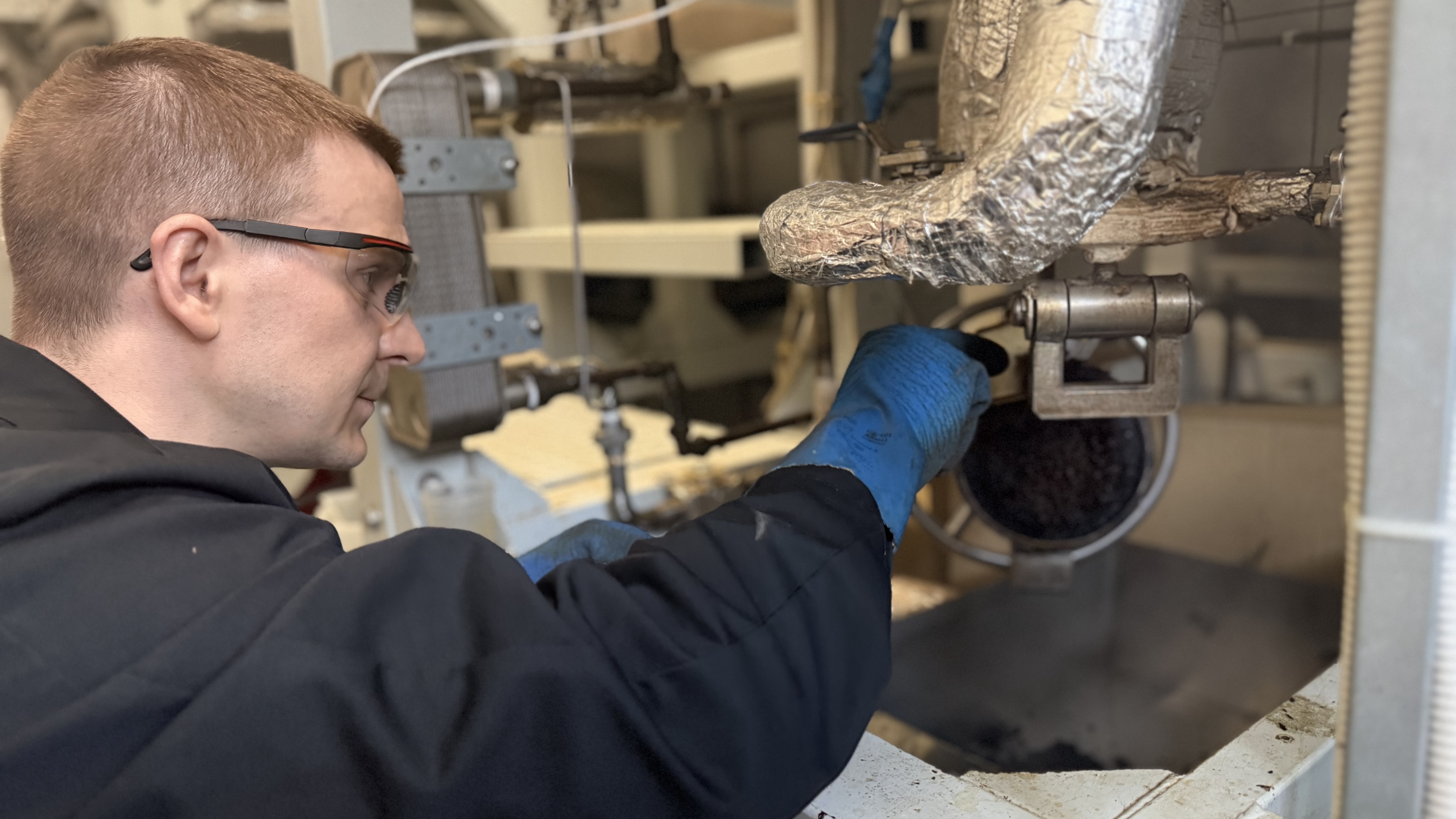 “Šī ir speciālas konstrukcijas iekārta, kur mēs izejmateriālu samaisam ar katalizatoru. Katrs maisījums ir individuāls, un mēs precīzi aprēķinām, cik daudz katalizatora nepieciešams,” stāsta Māris Puķe. “Mūsu gadījumā izmantojam fosforskābi, un svarīgi ir gan tās daudzums, gan koncentrācija.”
