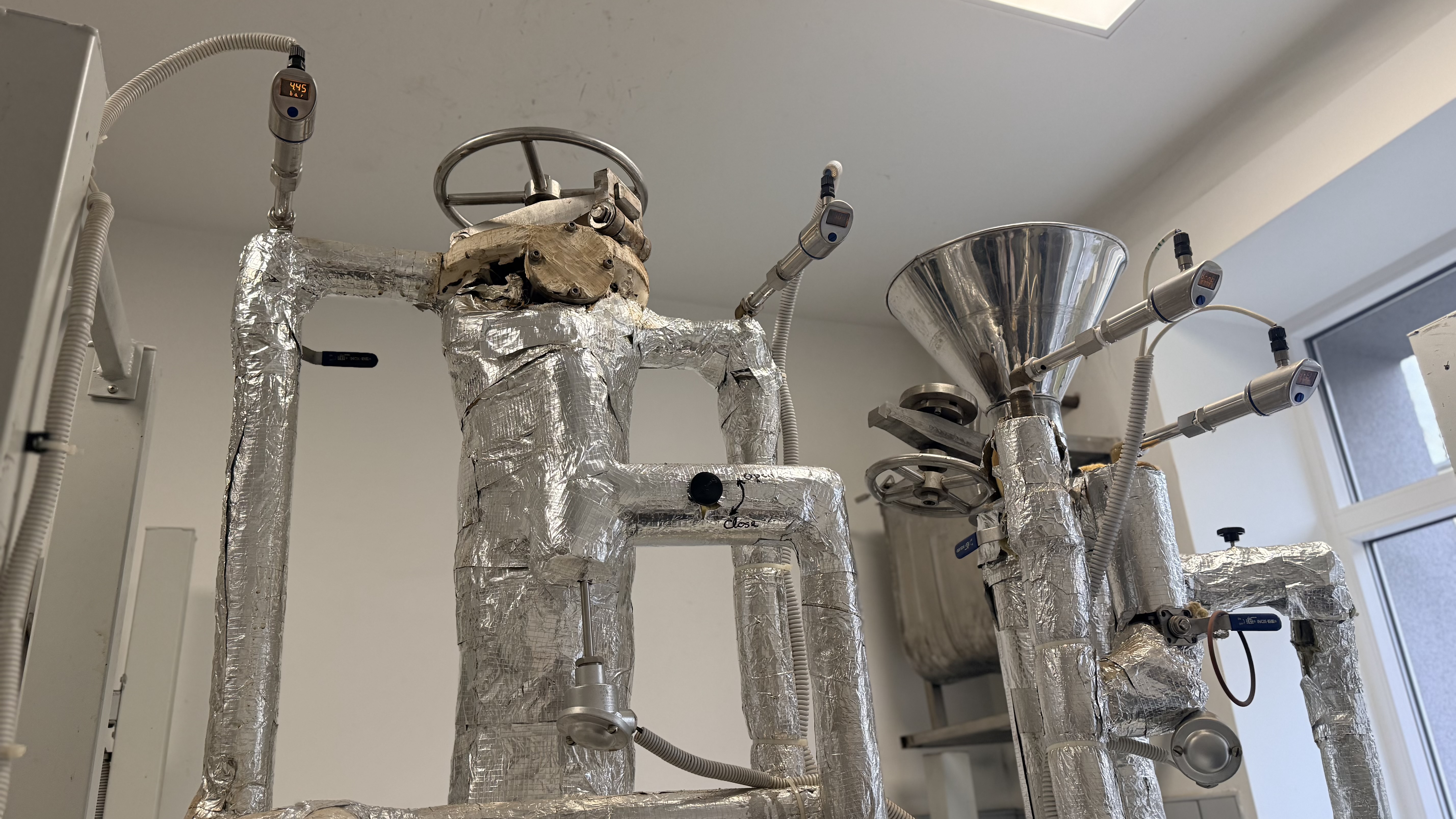 Pēc samaisīšanas materiāls tiek iebērts unikālā stenda pilotiekārtā, kurā notiek furfurola un citu savienojumu veidošanās. Lai gan iekārtas tilpums ir salīdzinoši neliels, tā ļauj modelēt rūpniecisku furfurola iegūšanas procesu.
