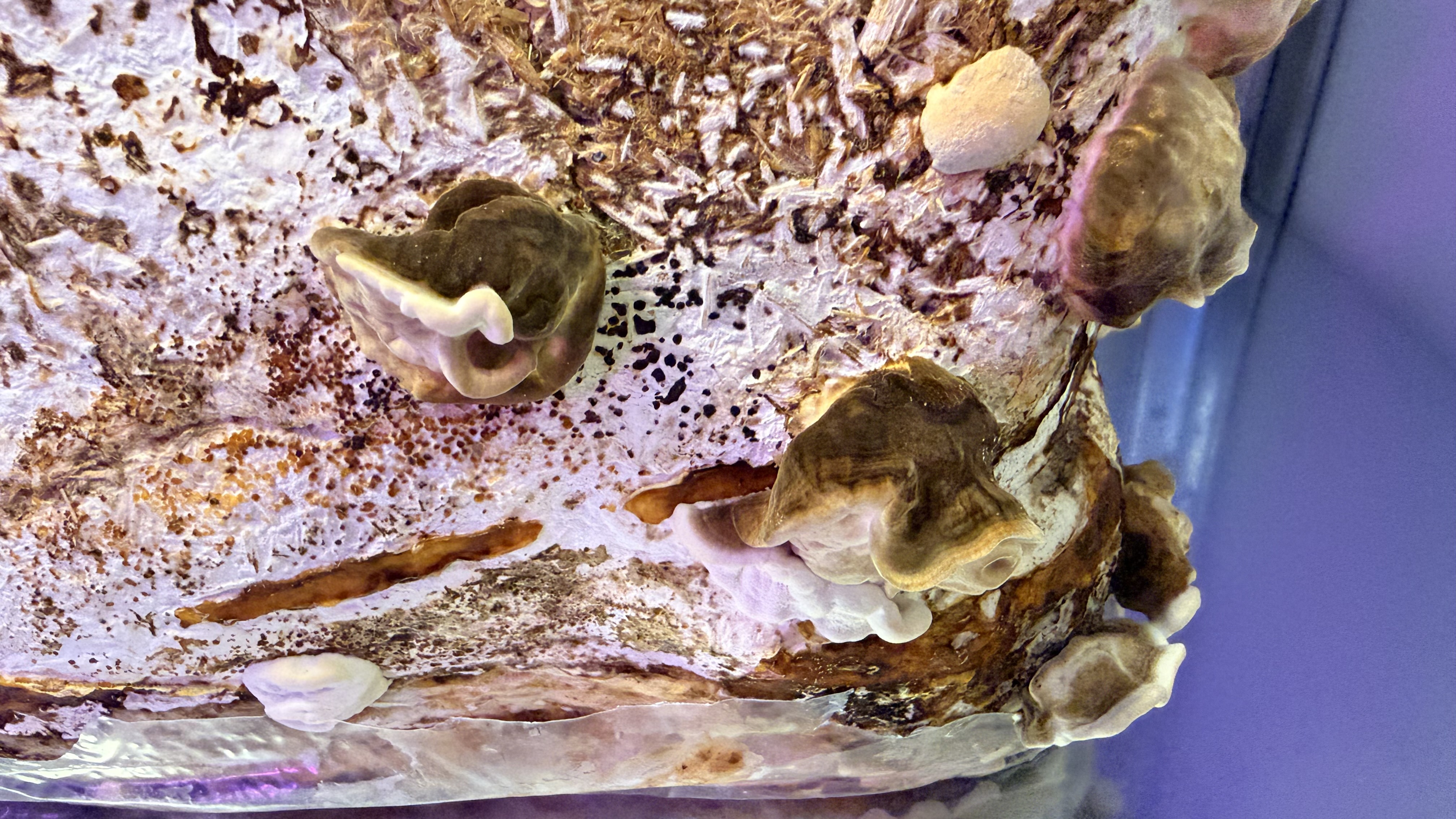 Augļķermeņu augšana: veidojas pilnvērtīgi augļķermeņi (ap 18 °C, ~85% mitrums, nepieciešama gaisma).