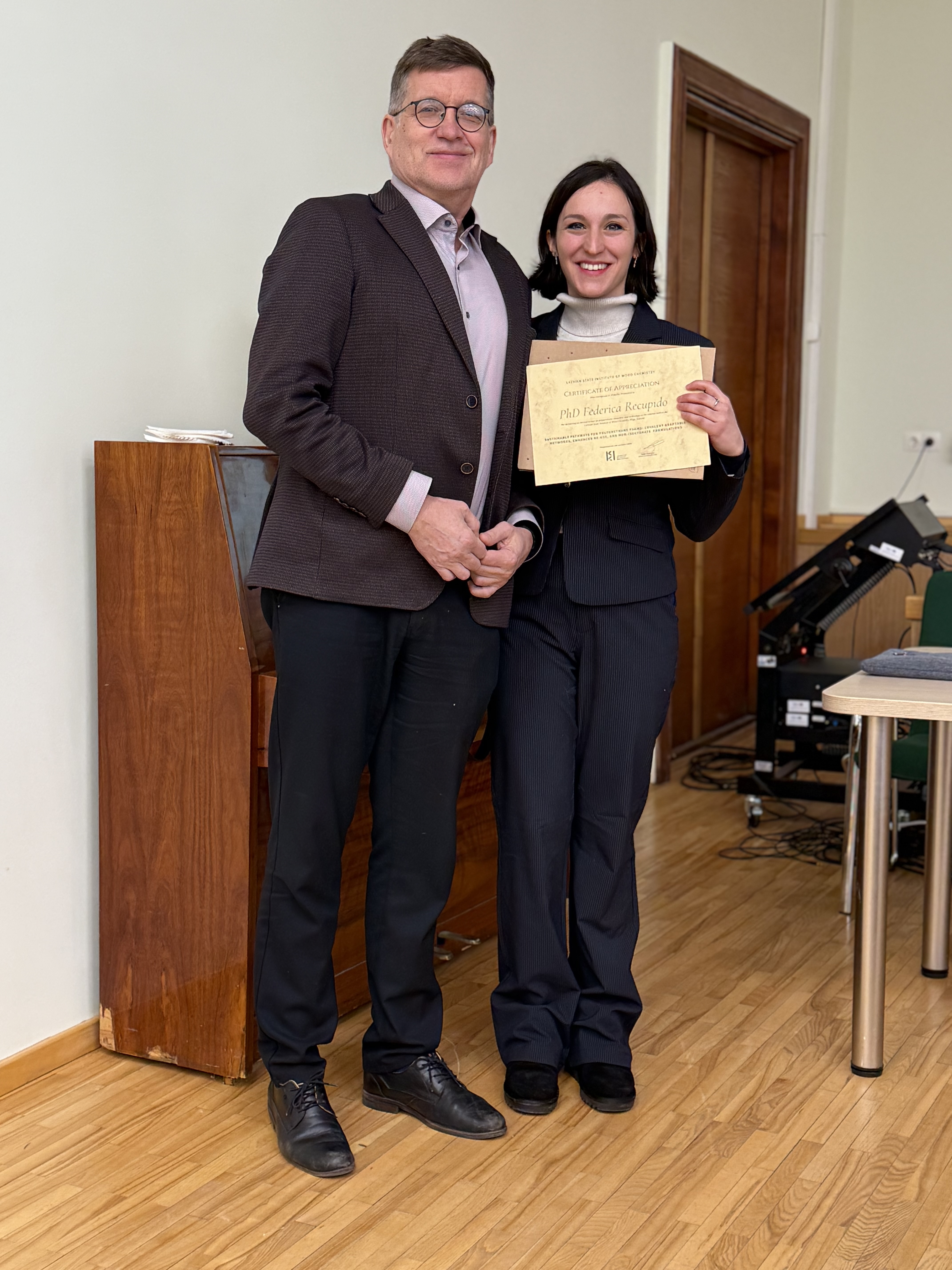 Otra semināra lektore – PhD Federica Recupido – savā lekcijā “Ilgtspējīgi risinājumi poliuretānu putām: kovalenti adaptējamas struktūras, uzlabota atkārtota izmantošana un bezizocianātu kompozīcijas” (Sustainable Pathways for Polyurethane Foams: Covalent Adaptable Networks, Enhanced Re-use, and Non-Isocyanate Formulations) stāstīja par pētījumiem, kuru mērķis ir materiāli ar uzlabotu mehānisko izturību un enerģijas absorbcija, kā arī 3D drukas risinājumu iekļaušana mākslas objektu aizsardzības pasākumos. Pētnieces uzmanības lokā ir arī alternatīvu izstrāde, kas ļauj aizstāt no neatjaunojamajām izejvielām sintezēto putupoliuretānu. Vienlaikus šie risinājumi nodrošina uzlabotu mehānisko izturību, enerģijas absorbciju un barjerīpašības.