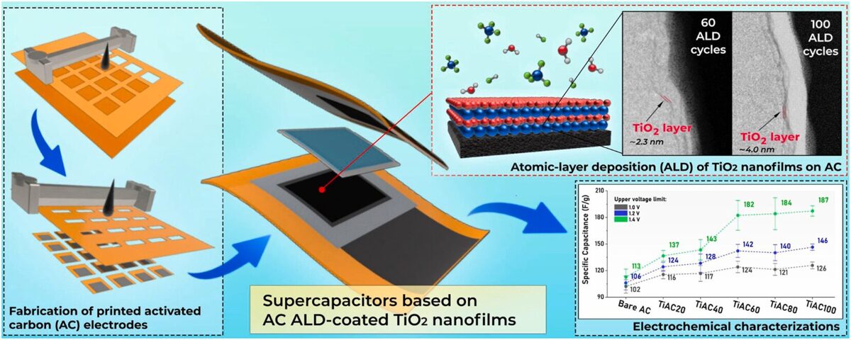 The study presents a novel approach to enhancing the electrochemical performance of supercapacitors by coating porous activated carbon (AC) electrodes with ultra-thin titanium dioxide (TiO₂) nanofilms using atomic layer deposition (ALD). The authors developed a low-temperature ALD process (120 °C) using TiCl₄ and H₂O precursors, optimized for high surface area substrates like AC.