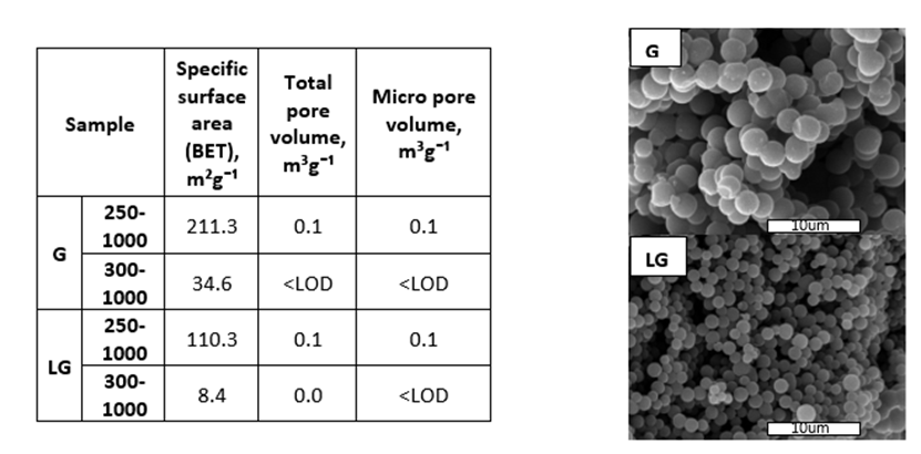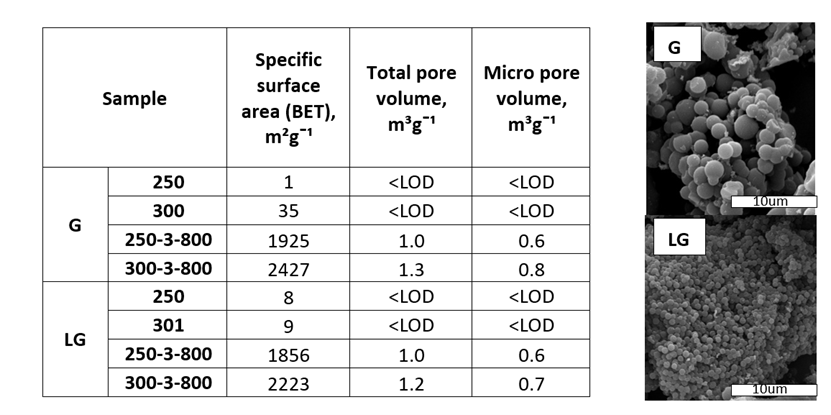 - Thermochemical activation of biochar derived from monosaccharides has been initiated using NaOH as an activating agent at 800 °C. To prevent particle disintegration, a thermal pre-treatment at 600 °C was applied prior to the activation step. As a result of successful activation, biochar with a high specific surface area (above 1900 m² g⁻¹) was obtained while preserving its spherical morphology.
