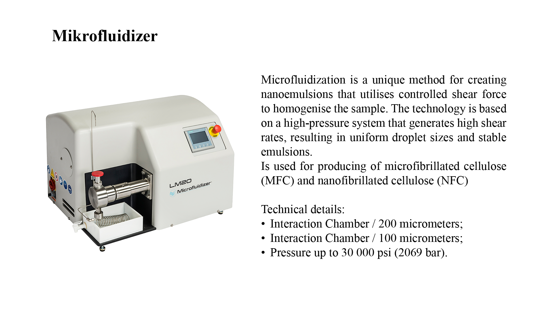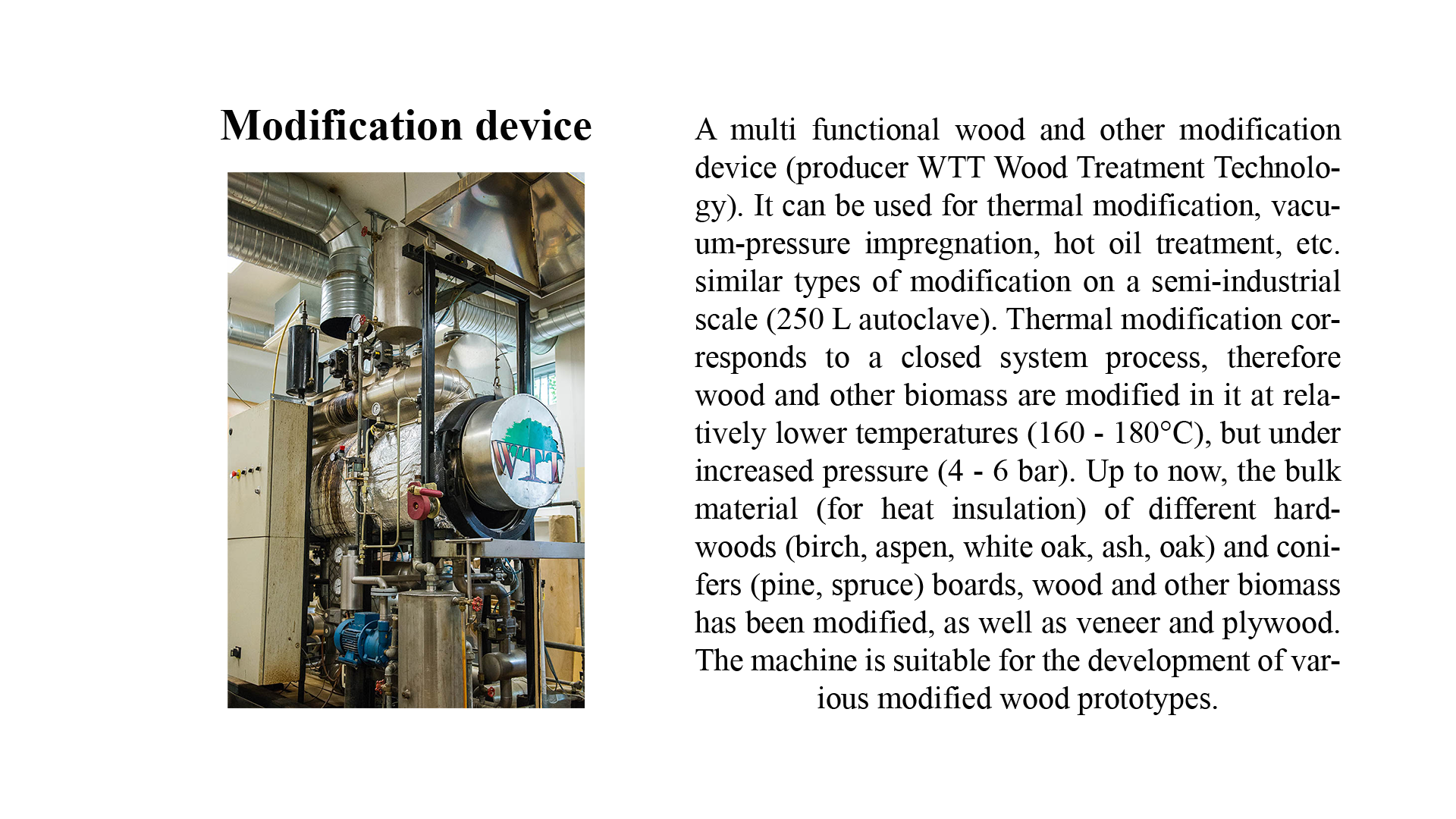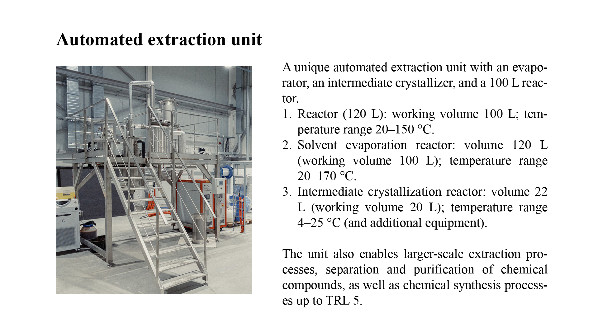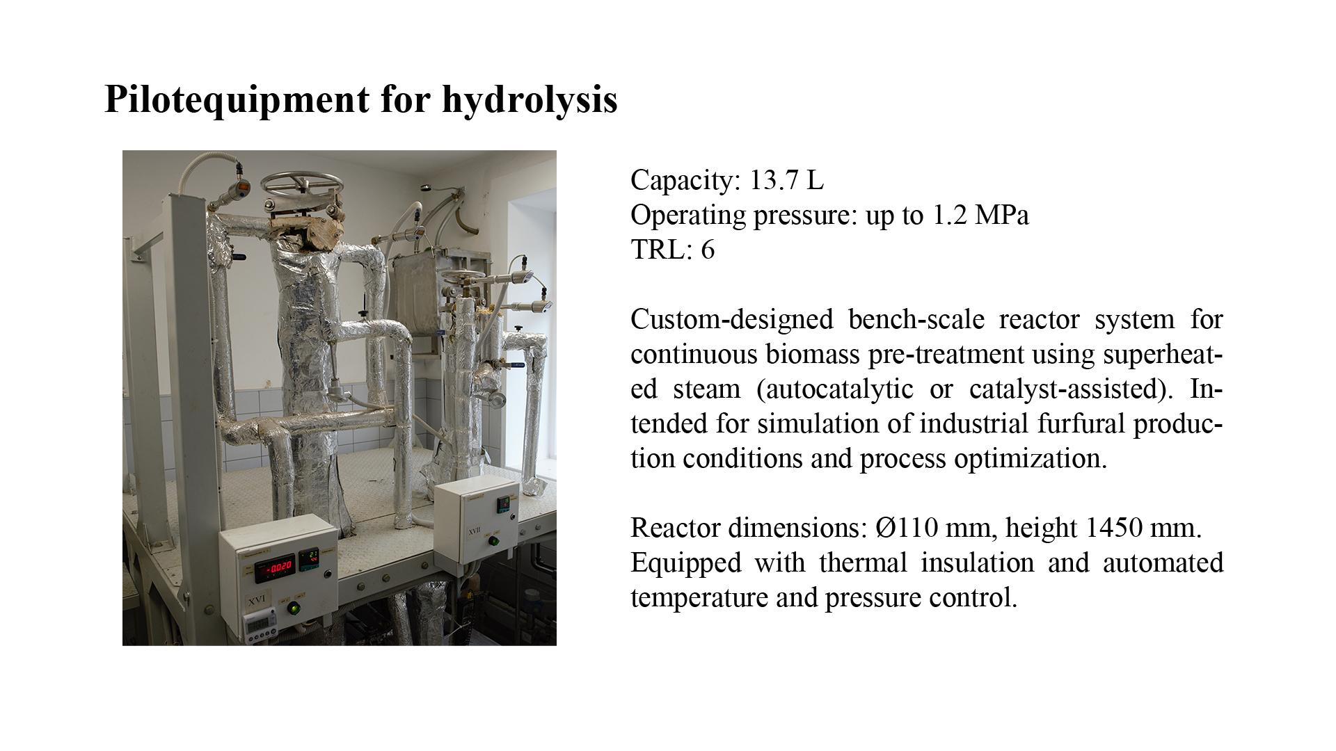 In 2020, the Pilot-Scale Hangar of the Latvian State Institute of Wood Chemistry was opened, which promotes the commercialization of the technologies developed in our laboratories. Raw material preparation and material production sections, biorefining process workshop, which includes biomass hydrolysis, pyrolysis, extraction, are available in the hangar; carbonization; steam explosion equipment for biomass decomposition. Pilot facilities provide an opportunity to up-scale laboratory processes developed at LSIWC or at the Institute's cooperation partners, reaching technological readiness level (TRL) 4-6.
