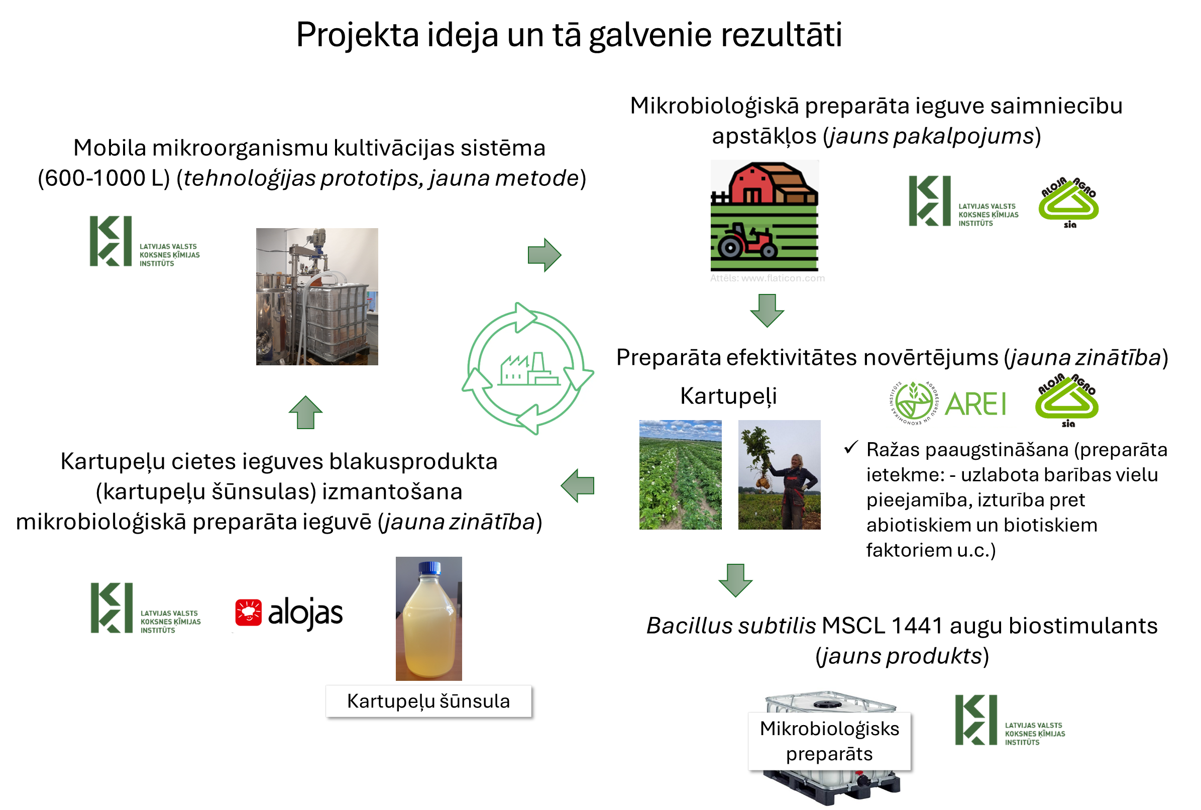 Projekta mērķa sasniegšanai paredzētas 8. aktivitātes. Projekta sākuma fāzē tiks uzsākts izzinošais un eksperimentālais darbs kartupeļu cietes notekūdeņu izmantošanai mikrobioloģisko preparātu ieguvei (1. aktivitāte). Veiks lauka pētījuma plāna sastādīšanu 2025. gada sezonai (2. aktivitāte). Darbs pirmajā aktivitātē paredzēts līdz 2026. gada vidum. Līdz ar 2025. gada sākumu un līdz projekta noslēgumam (2026. gada decembris) realizēs tehnoloģijas - B. subtilis preparāta ieguve 600-1000 L HDPE polimērmateriāla bioreaktora prototipā, un pakalpojuma - konsultatīvais un tehniskais serviss mikrobioloģiskā preparāta ieguvei saimniecību apstākļos, tehniski ekonomisko priekšizpēti (3. aktivitāte). 4. aktivitātes ietvaros veiks Bacillus subtilis MSCL 1441 mikrobioloģiskā preparāta ieguvi lauka izmēģinājumiem, kas paredzēti 2025. un 2026. gada sezonās. 2025. gada sezonā preparāta ieguve paredzēta primāri ar nerūsējošā tērauda 100 L bioreaktoru; līdztekus strādās pie atbiltošas kvalitātes mikrobioloģiskā preparāta ieguves izstrādājamajā (5. aktivitāte) 600-1000 L HDPE polimērmateriāla bioreaktora prototipā. 6. un 8. aktivitātes ietvaros, attiecīgi 2025. un 2026. gados, veiks mikrobioloģiskā preparāta efektivitātes novērtējumus. 7. Aktivitātes ietvaros demonstrēs Bacillus subtilis MSCL 1441 mikrobioloģiskā preparāta ieguvi 600-1000 L HDPE polimērmateriāla bioreaktora prototipā SIA Aloja Agro saimniecības apstākļos.